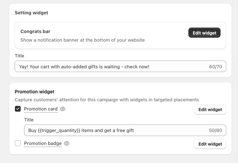 * **Promotion card**: Display promotion information and gift conditions directly on the product page. Customize the card’s title and style according to the messages you want to deliver.