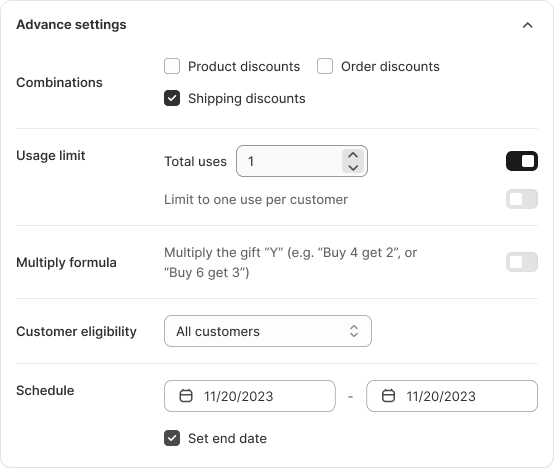 To avoid customers receiving too many gifts from a single discount—which can lead to a poor shopping experience and unnecessary losses—you can enable **“Limit to one use per customer”.**