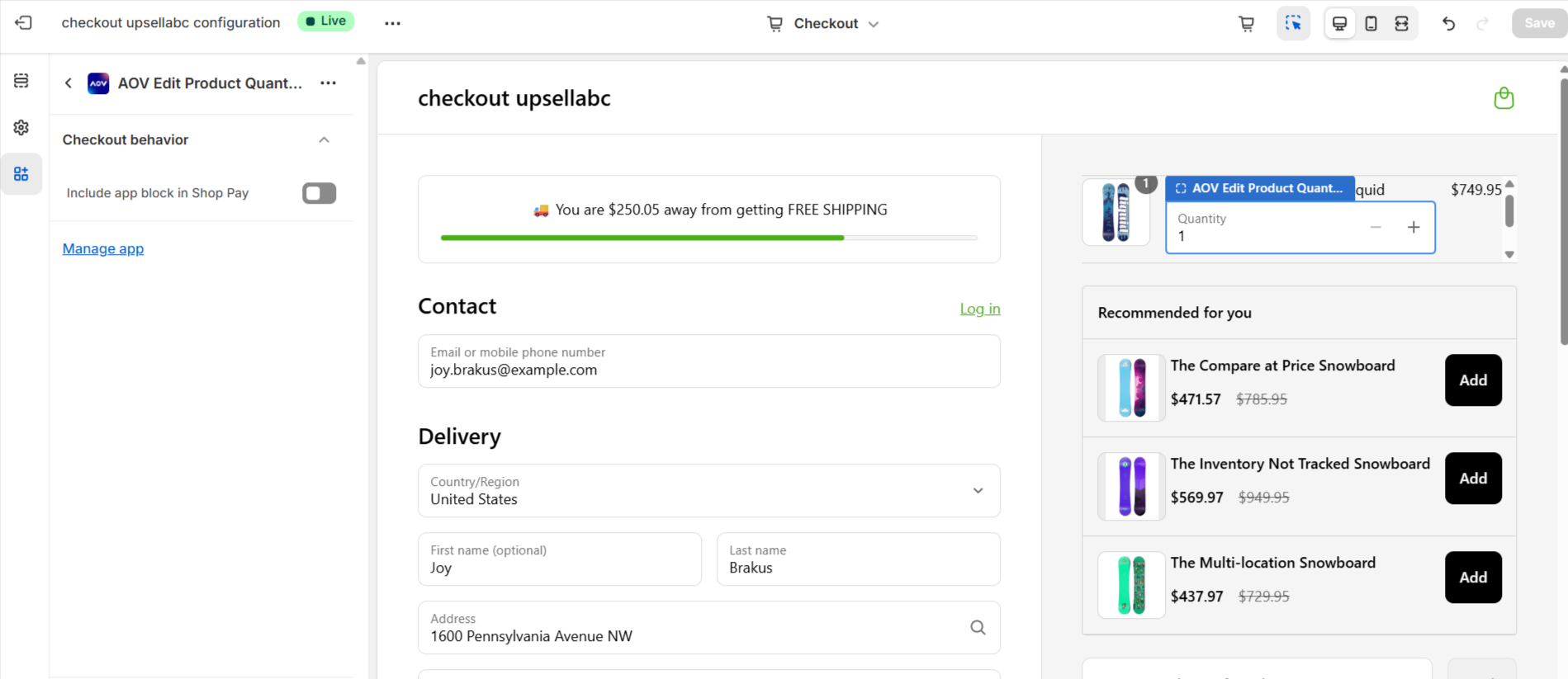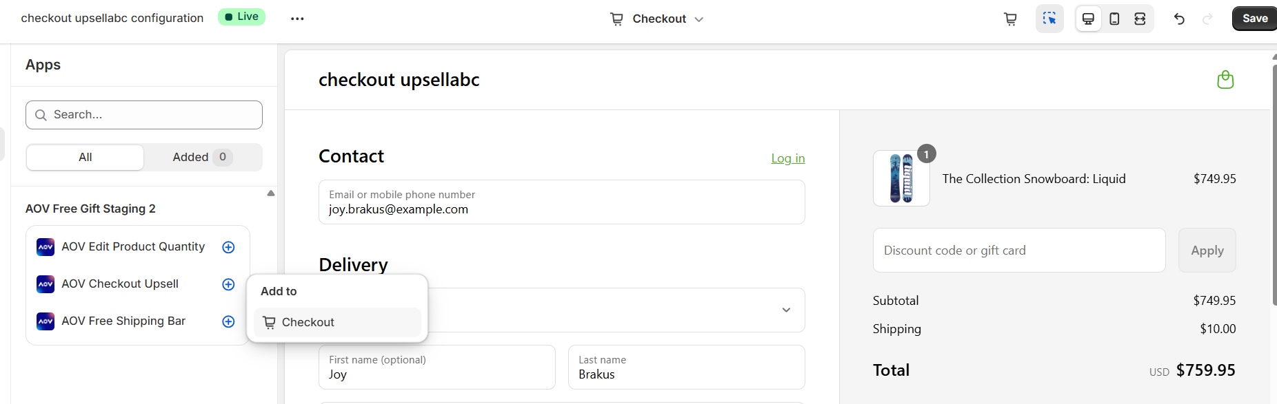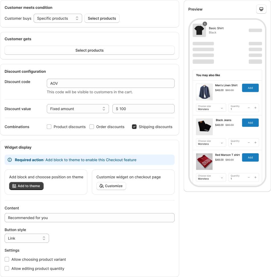 * Make sure you added the “AOV Checkout Upsell” block in your **Checkout theme**