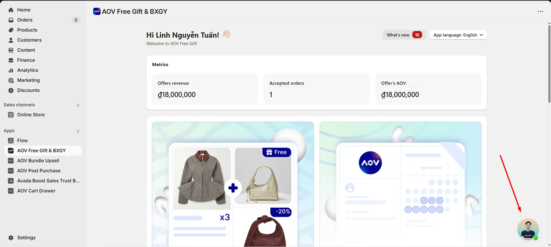 To make it visible on your storefront, go to **Online Store > Theme > Customize > App Embeds** and enable the **AOV Free Gifts** app.