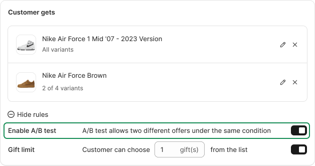 Enable A/B Testing to randomly offer 2 types of gifts to customers. Doing so will help you understand what customers want and create the best offer to boost revenue.