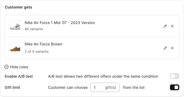 * If the gift has multiple variants, you can choose which one you want to offer or leave the decision to customers.