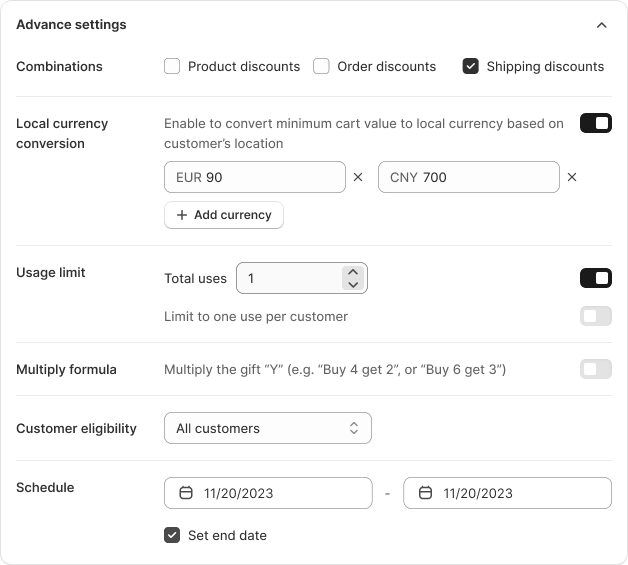 To avoid customers receiving too many gifts from a single discount—which can lead to a poor shopping experience and unnecessary losses—you can enable **“Limit to one use per customer”.**