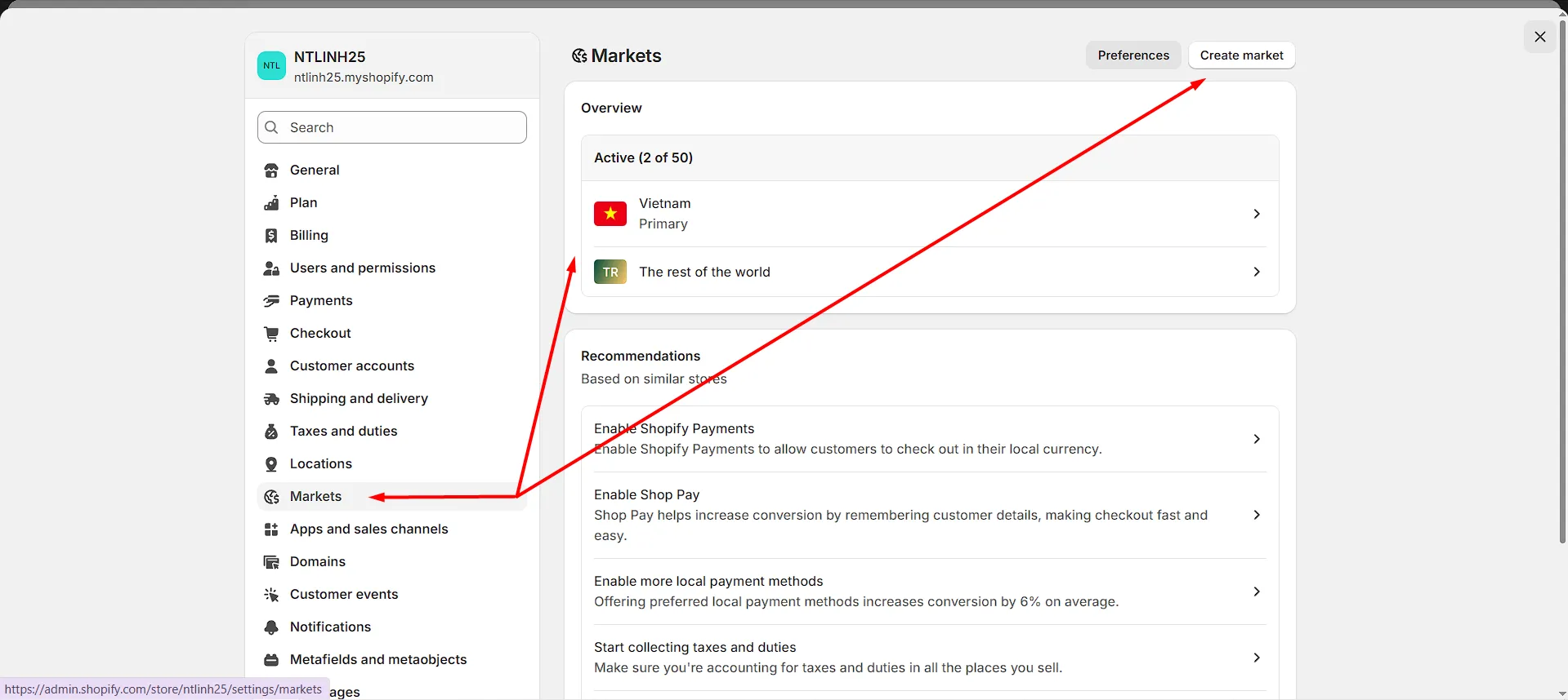 Before adding the currency you want to convert, you must first set up **markets** in your Shopify Admin settings. Please navigate to **Settings** > **Markets** > **Create market**/**change existing market**.