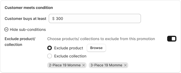 * **Exclude products/collections**: You can also choose to exclude specific product(s) or collections from this promotion by clicking **Browse** and choosing the expected product(s). In short, customers won’t receive the offer if they buy products from this section.